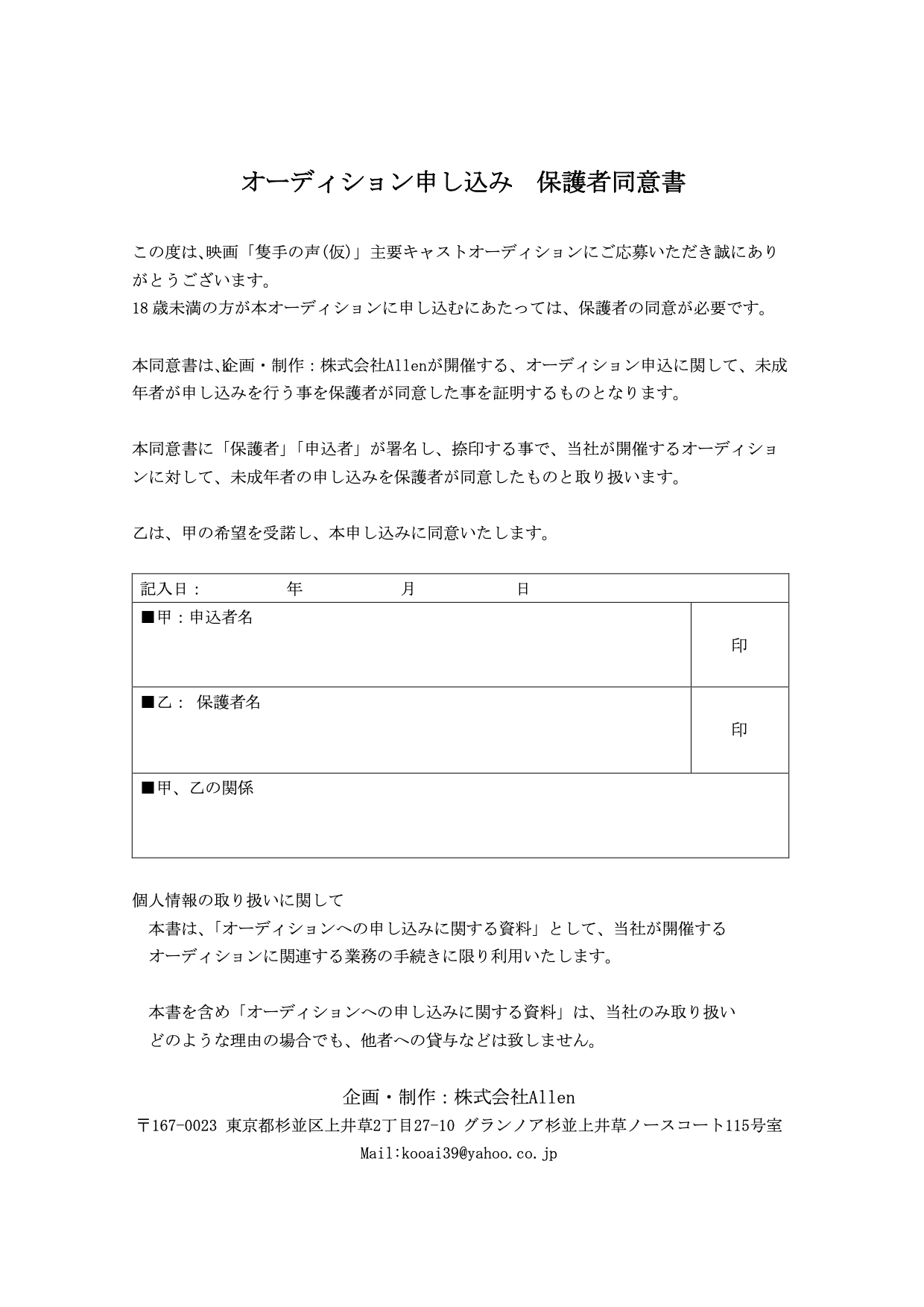 Mail:kazuseal@me.com (キャスティング担当:五藤)
